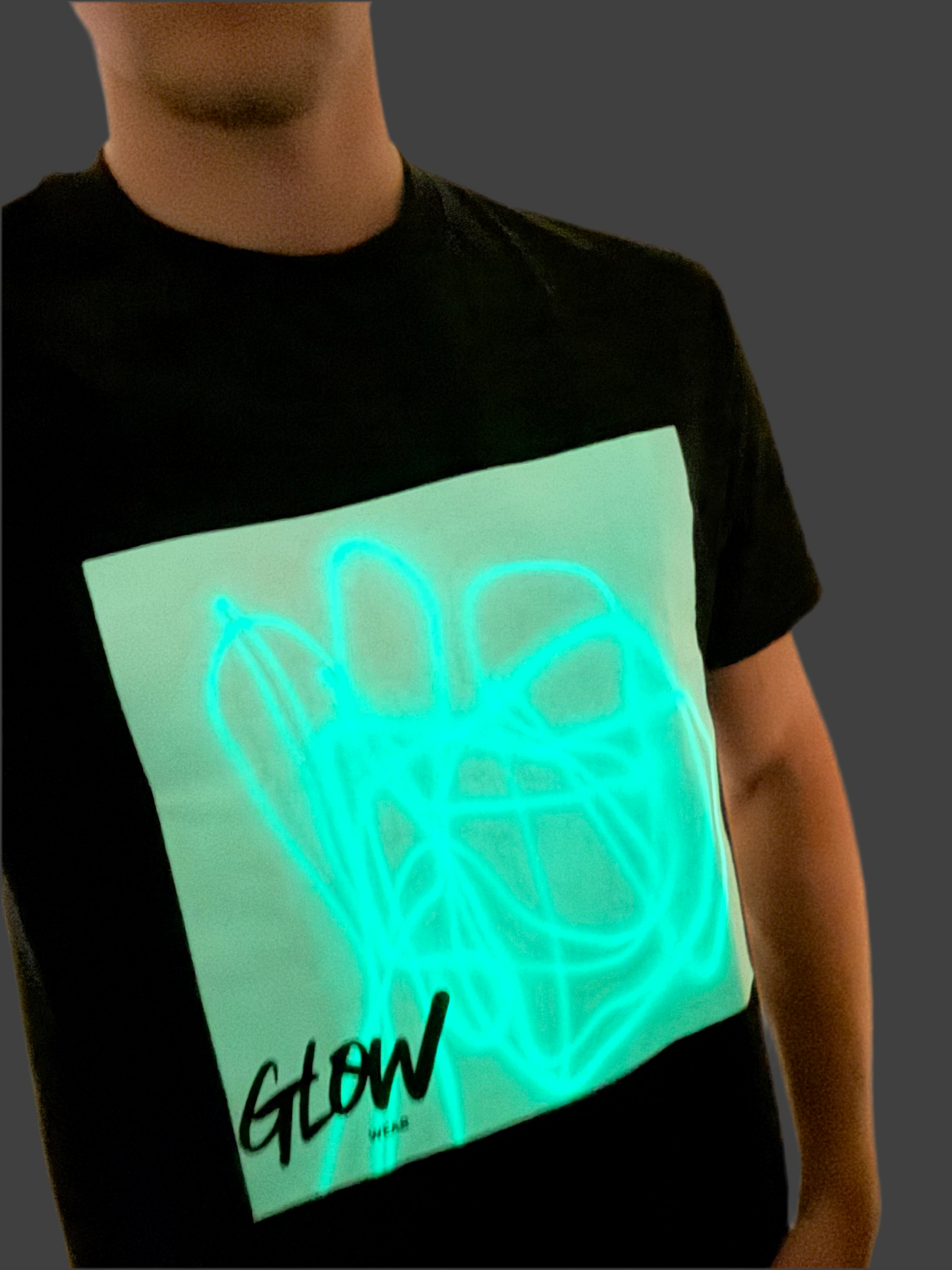 En T-shirt med ett tryck som lyser grönt när trycket utsätts för ljus. Vi rekommenderar att använda telefon lampan för bäst effekt. Tröjan är gjord av 100% bomull
