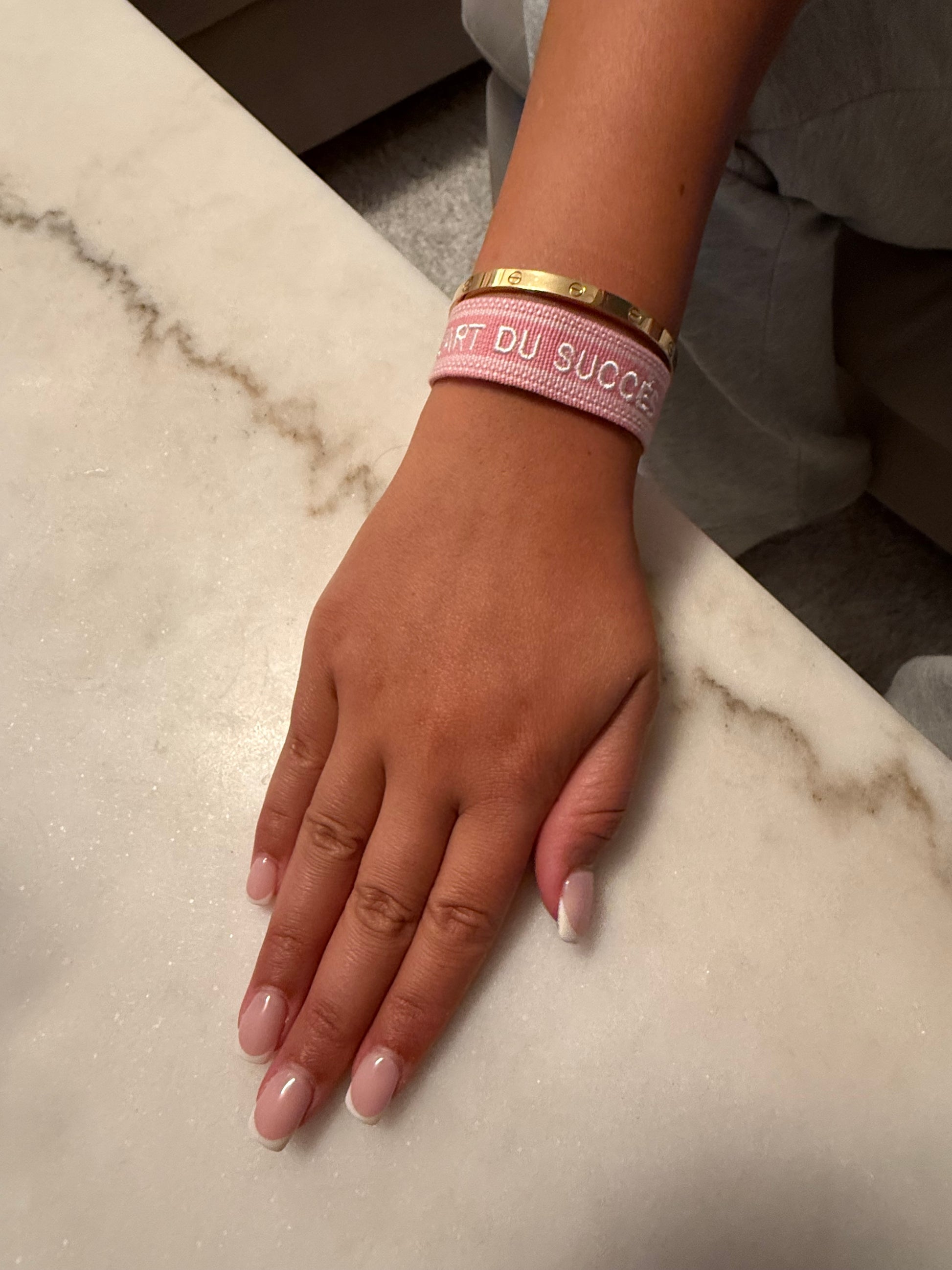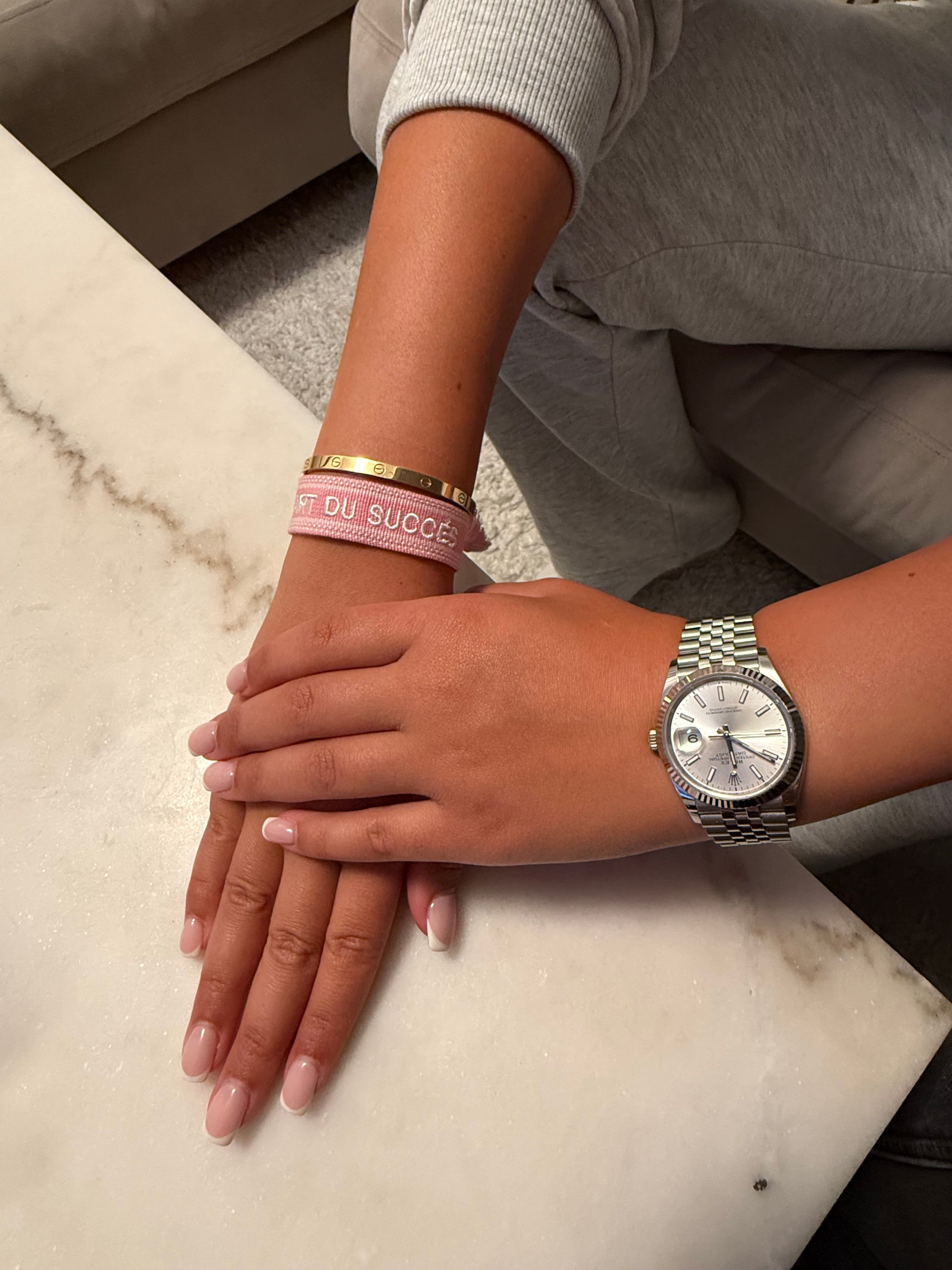 Perfekt för den som vill ge sin stil ett lyft och uttrycka sin personliga framgång, är detta rosa armband en tidlös accessoar. Bär det för att påminna dig själv om din resa och om att du förtjänar det bästa.